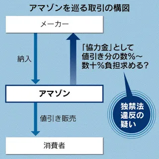 我會注意到這件事,是因上月底《日經新聞》出現一則新聞,全文翻譯詳見文末。「協力金」姑且譯為「共同維護費」吧,意思可解釋為「因為我要提供更好的服務,所以希望身為產業鏈一份子的廠商也能共同分擔」,日本亞馬遜以此為名目要求自營部門的廠商支付1~5%的共同維護費,廠商自然反應不一。雖然可看作是合作條件的一部分,但據稱日本亞馬遜談判時以終止往來對廠商施加壓力,剛才翻譯下述文章時不免好奇後續發展,以關鍵字搜尋後發現,此事確實已引起日本公平交易委員會關注並介入調查,NHK、朝日新聞等都出現相關報導。1